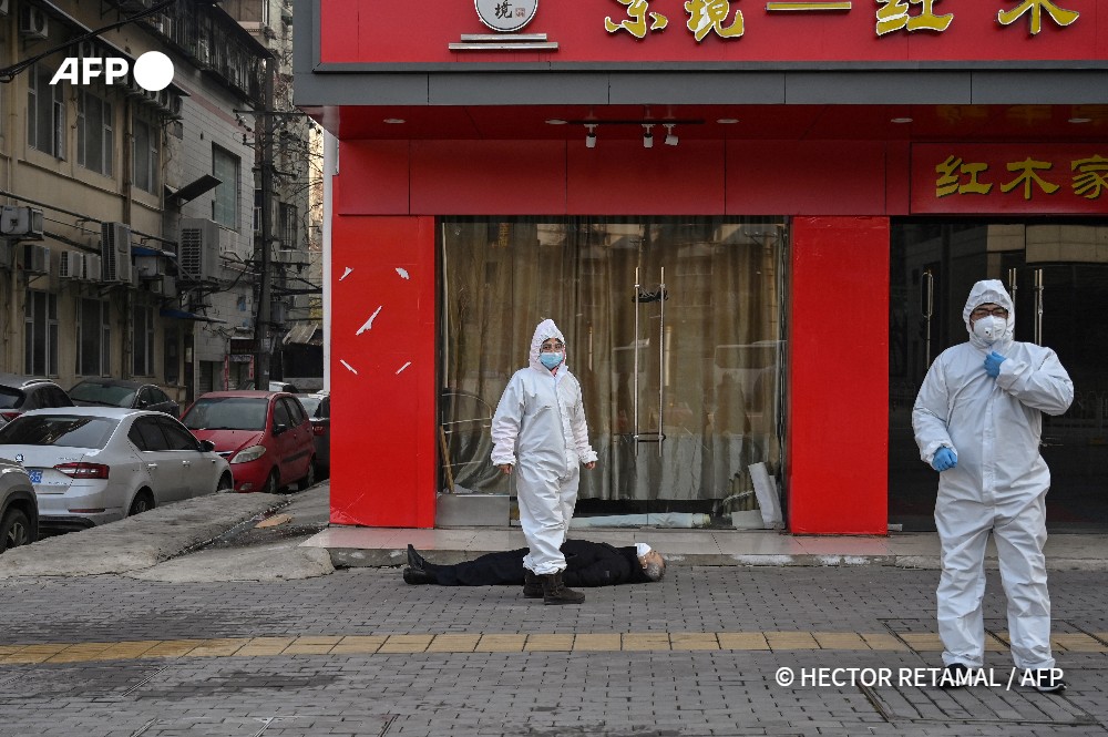 30/01/2020 - WUHAN, CHINE - Des fonctionnaires en combinaison de protection examinent un homme âgé, décédé dans une rue près d'un hôpital de Wuhan. © HECTOR RETAMAL / AFP