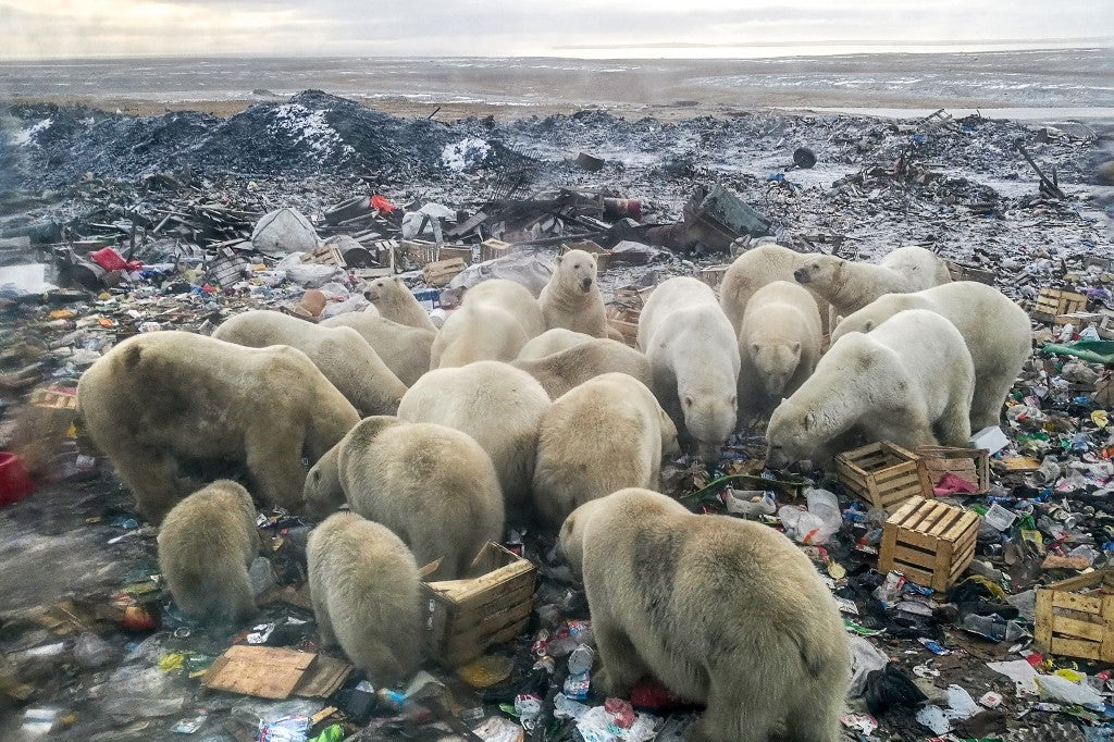 Des ours polaires s'alimentent dans une décharge d'ordures près du village de Belushya Guba, sur l'archipel de Nouvelle-Zemble en Russie. Alexander GRIR/AFP